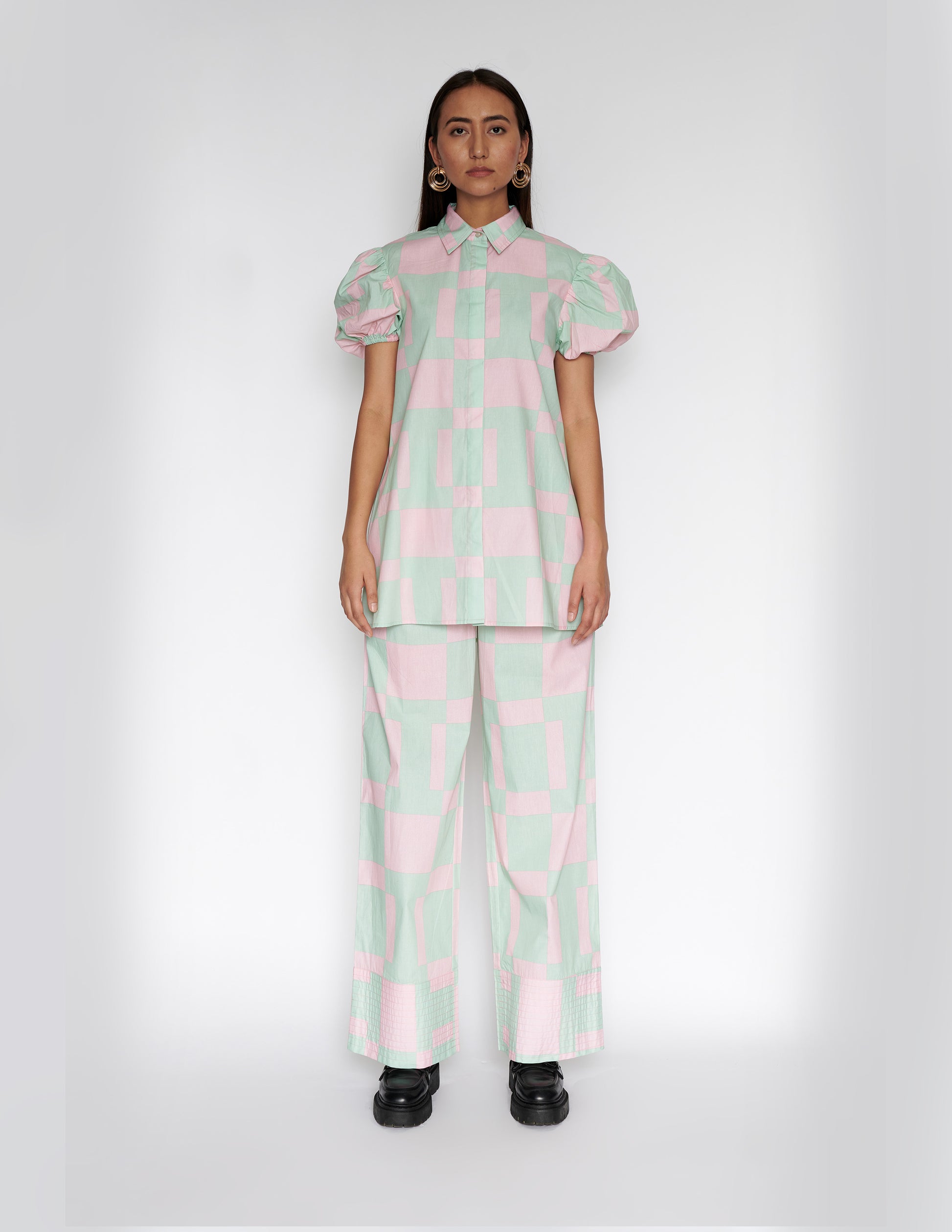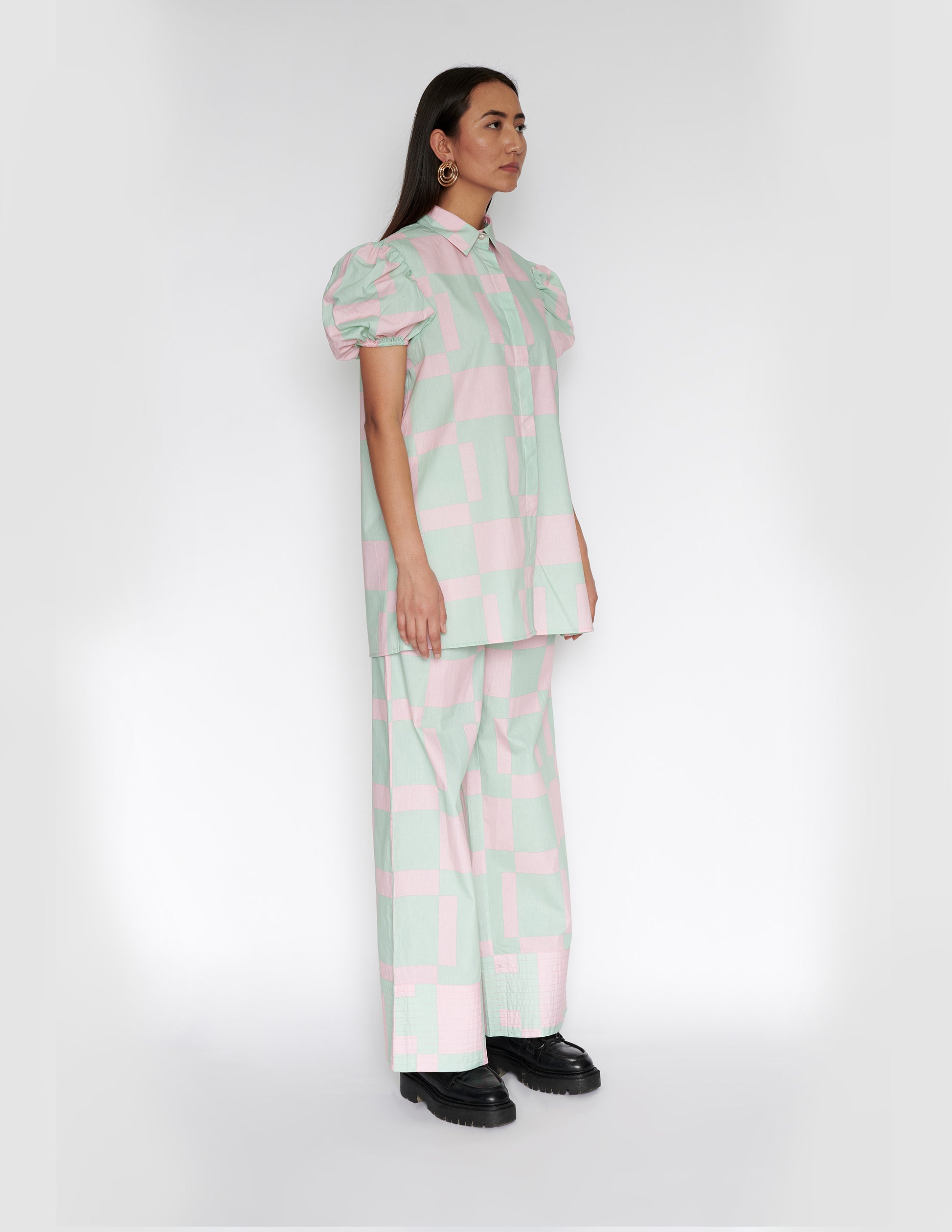 Wide leg recto trouser with quilted panel.
