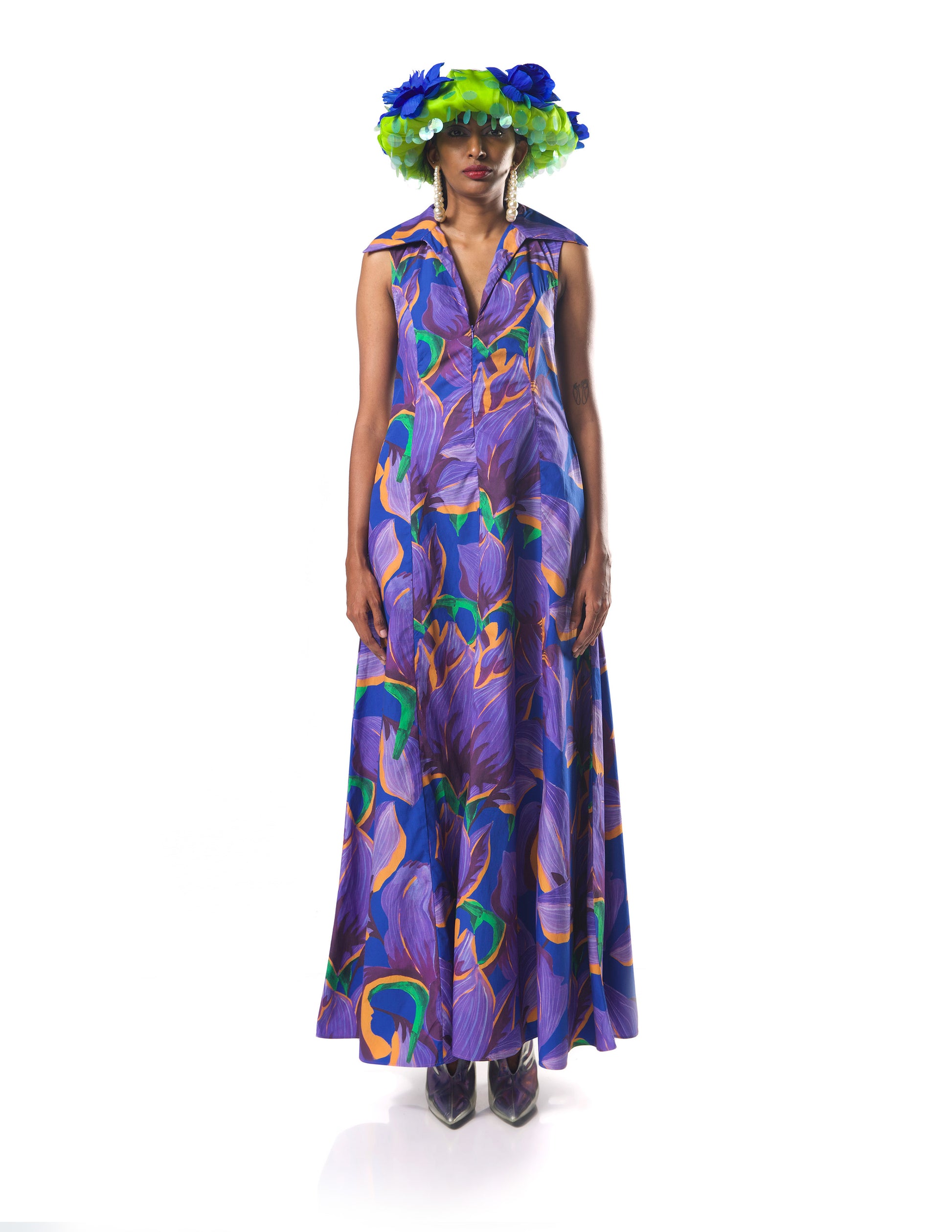 Princess line maxi dress with lapel collar and concealed zipper closure