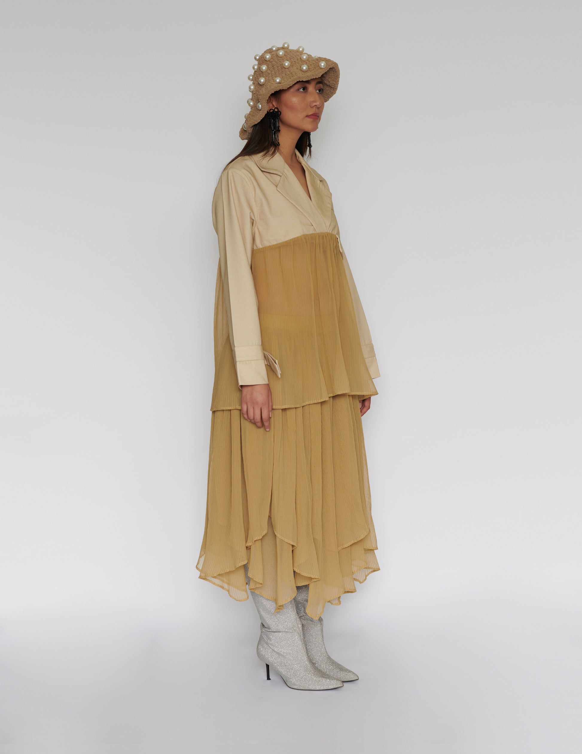 Trench shirt with lapel collar and accordion pleat body and belted wrist line.