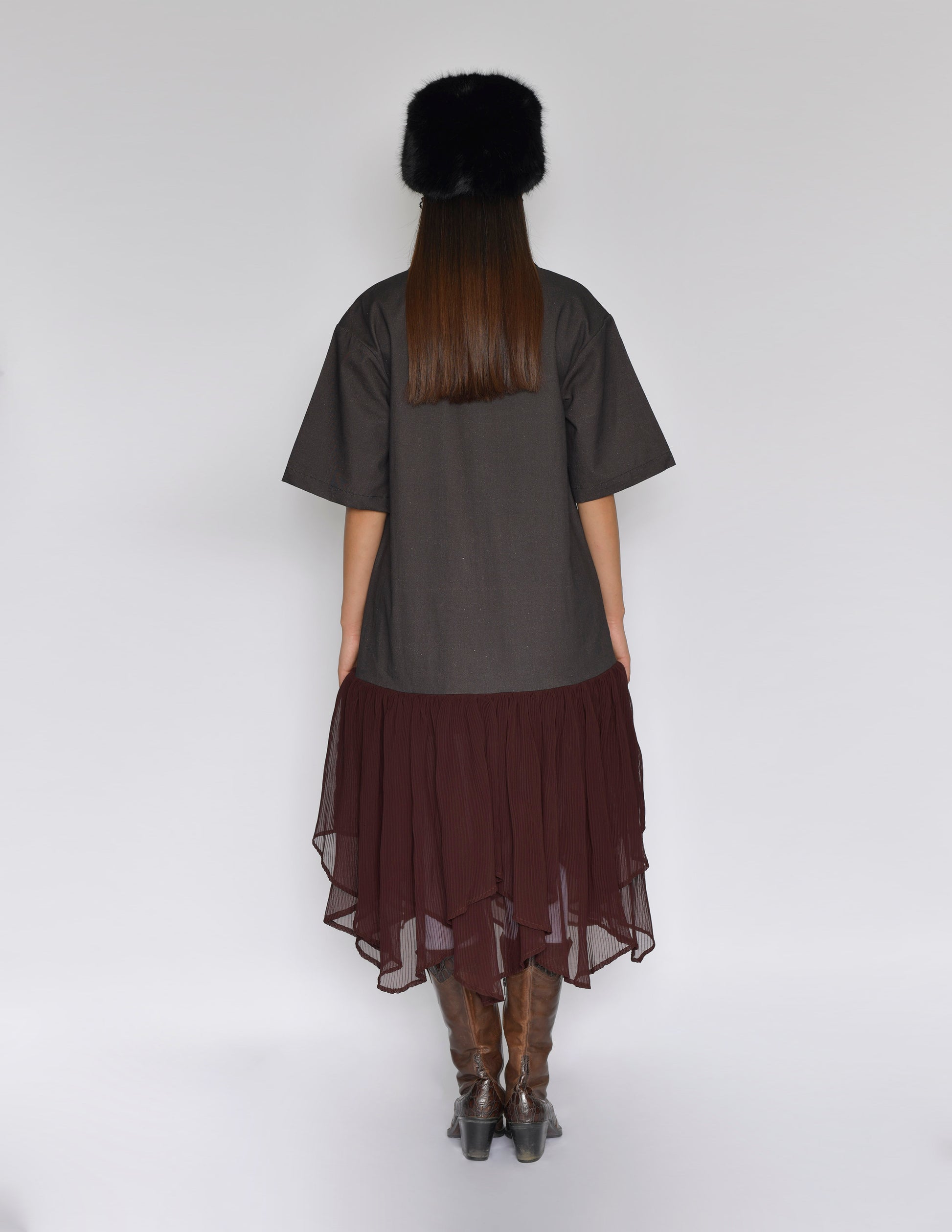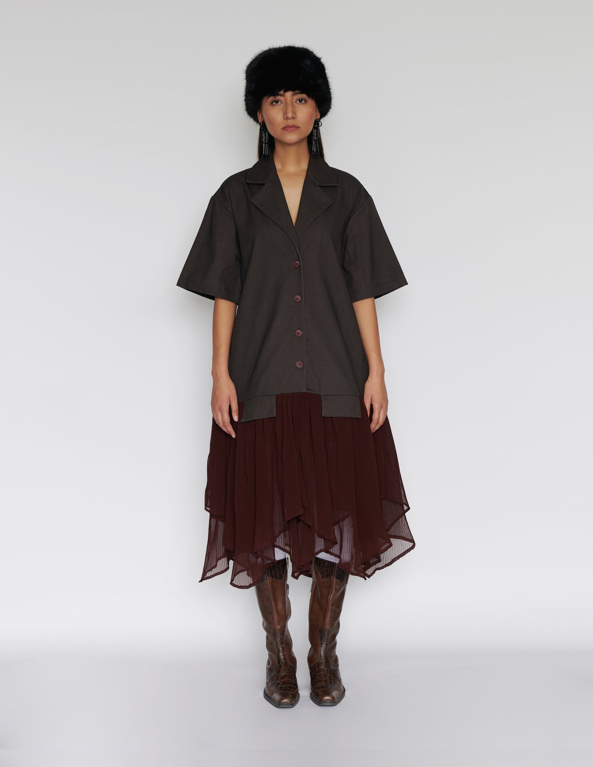 Trench shirt dress with lapel collar and pleated handkerchief hem